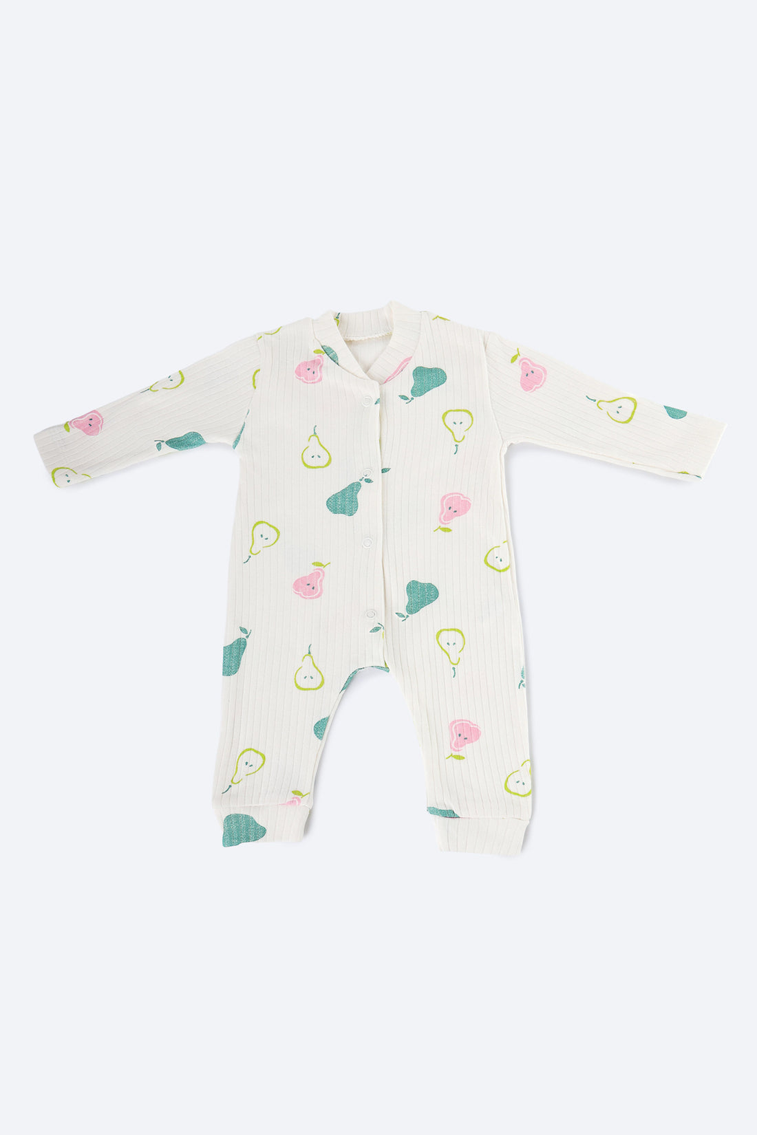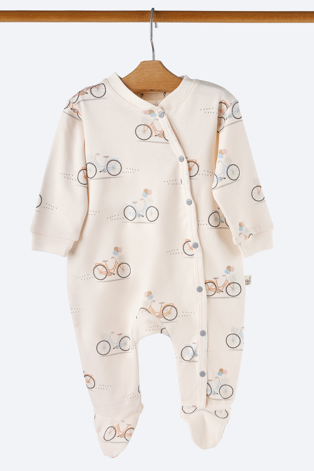 Bisiklet desenli, uzun kollu tulum takım. %100 pamuk organik kumaş. Önden çıtçıtlı, ayaklar bütün. Bileklerde...