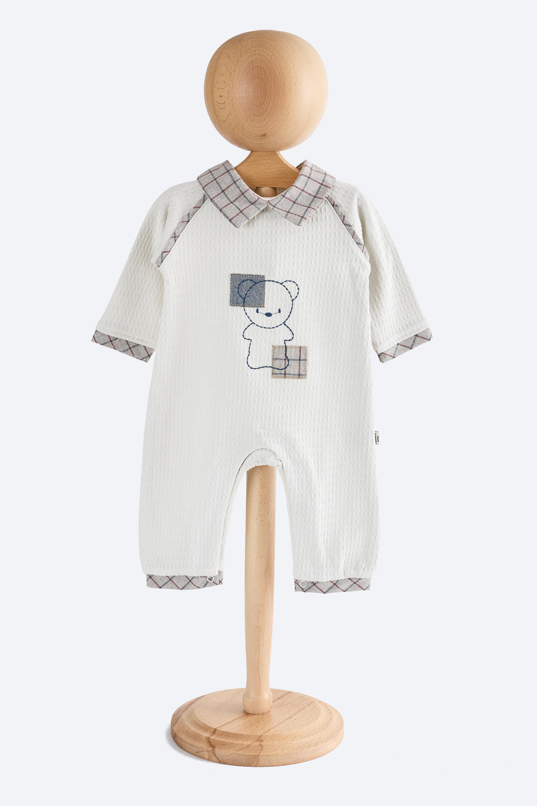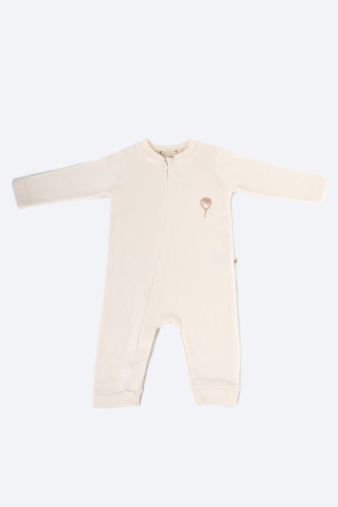 Balon desenli uzun kollu tulum, bej rengi. %100 pamuk, organik jakarlı kumaş. Önden fermuarlı bereli,...