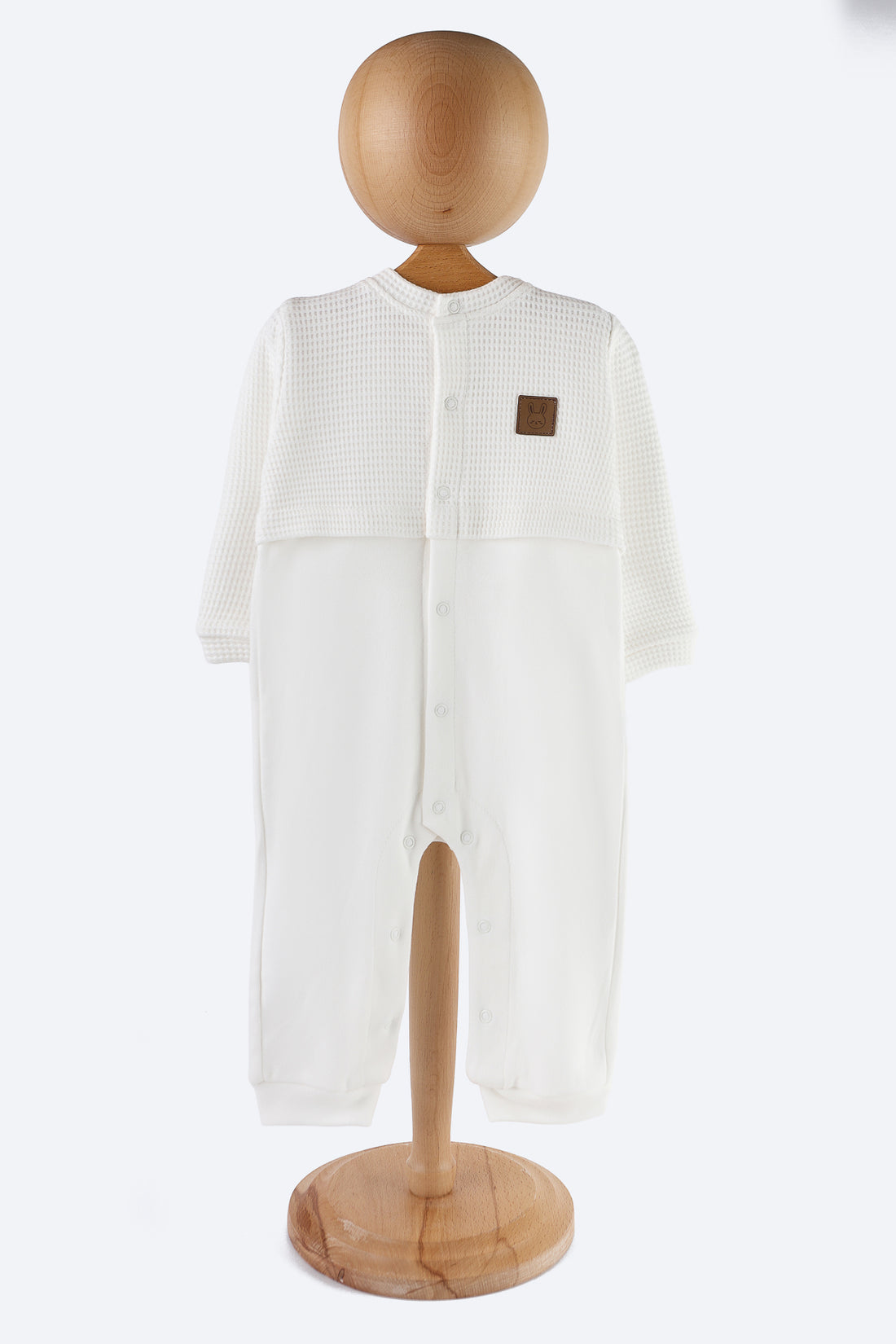 Beyaz uzun kollu tulum, robadan rapor kumaşlı, alt kısmı düz %100 pamuk kumaş. Önden çıtçıtlı....