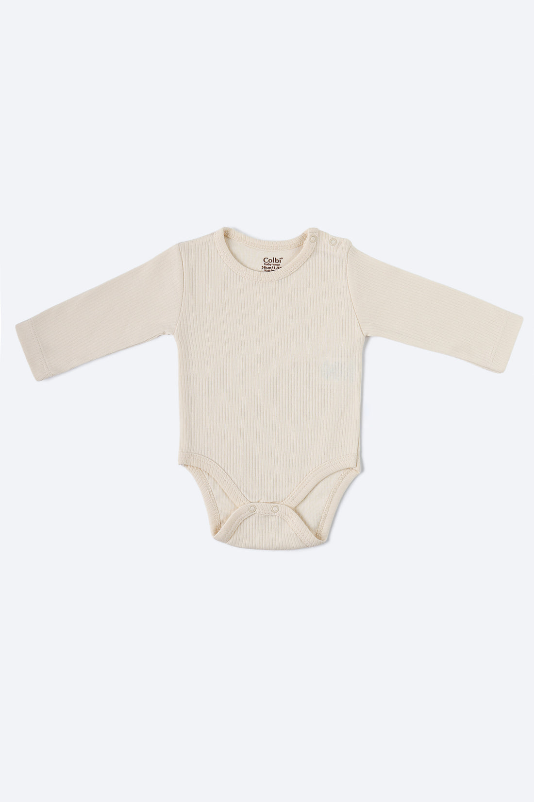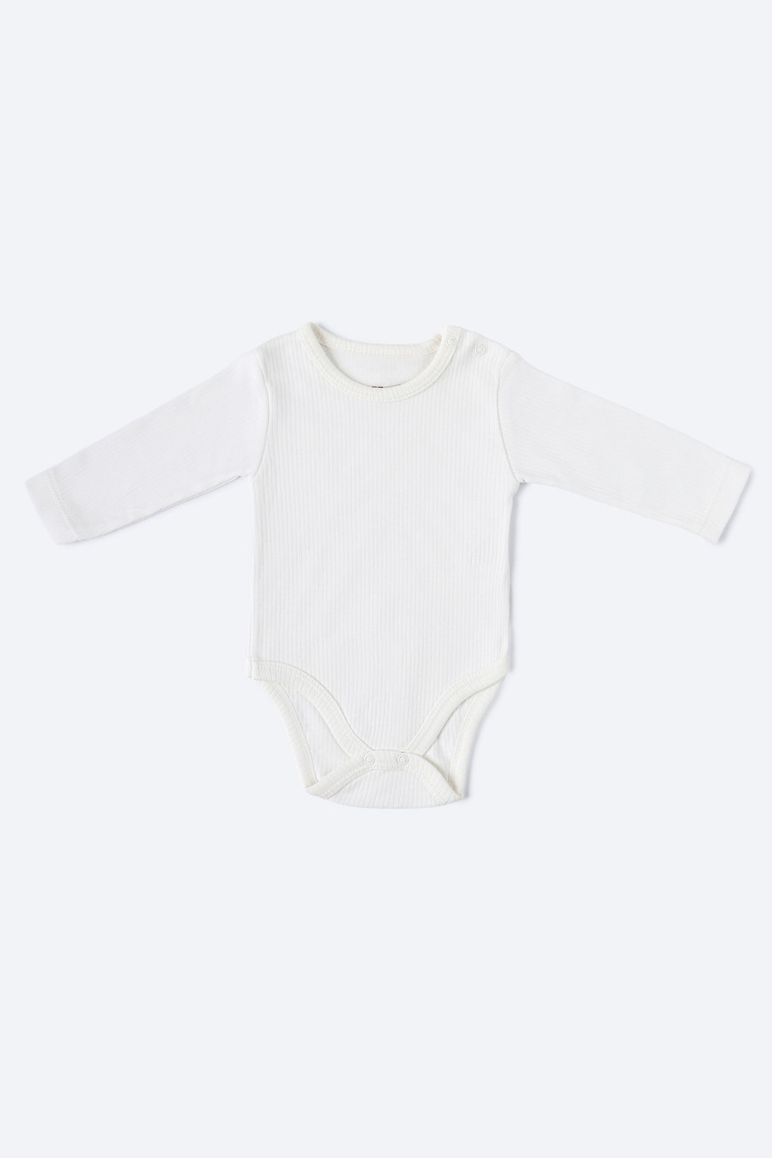 Beyaz renkli uzun kollu body, omuzdan çıtçıtlı. %100 pamuk, bisiklet yaka, raporlu kumaş türü. Altta...