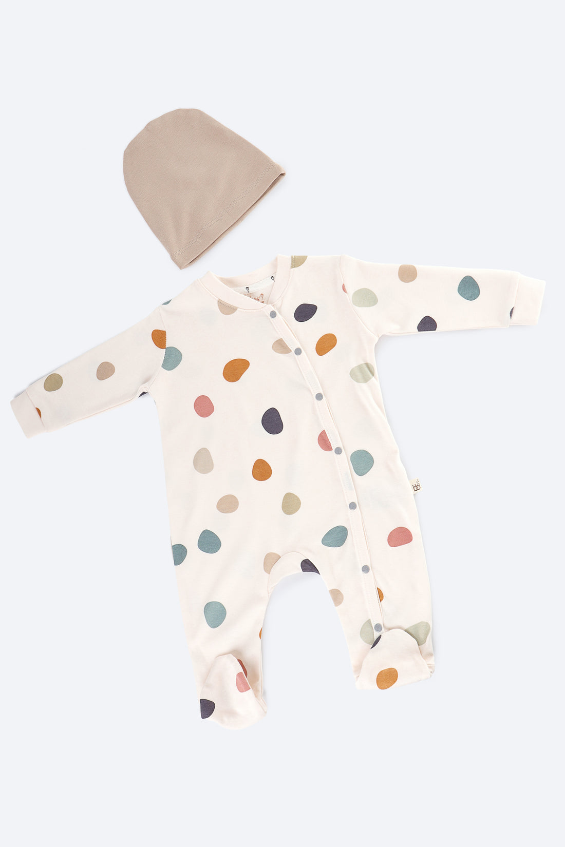 Renkli puantiyeli, uzun kollu tulum ve bere takım. %100 pamuklu organik kumaş. Önden çıtlıtlı, ayaklar...