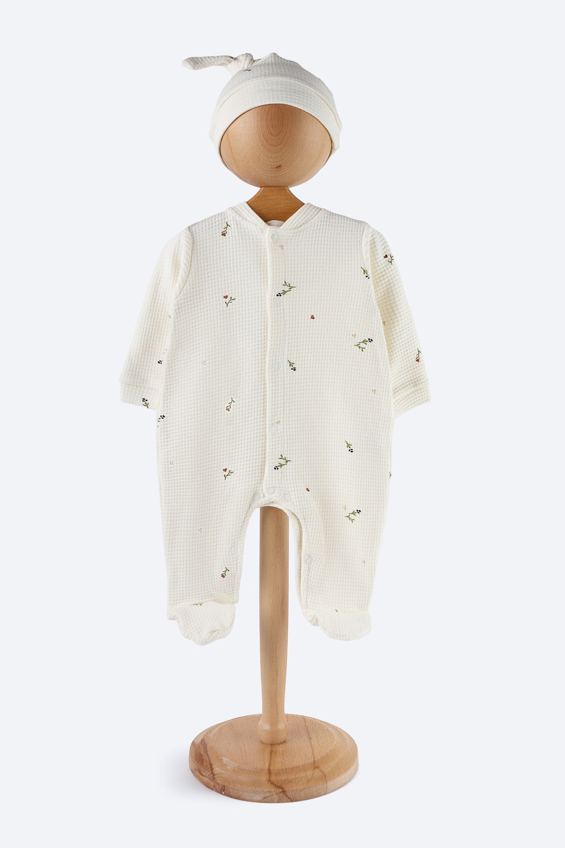 Minik çiçek desenli tulum. Waffle kumaştan % 100 pamuk.