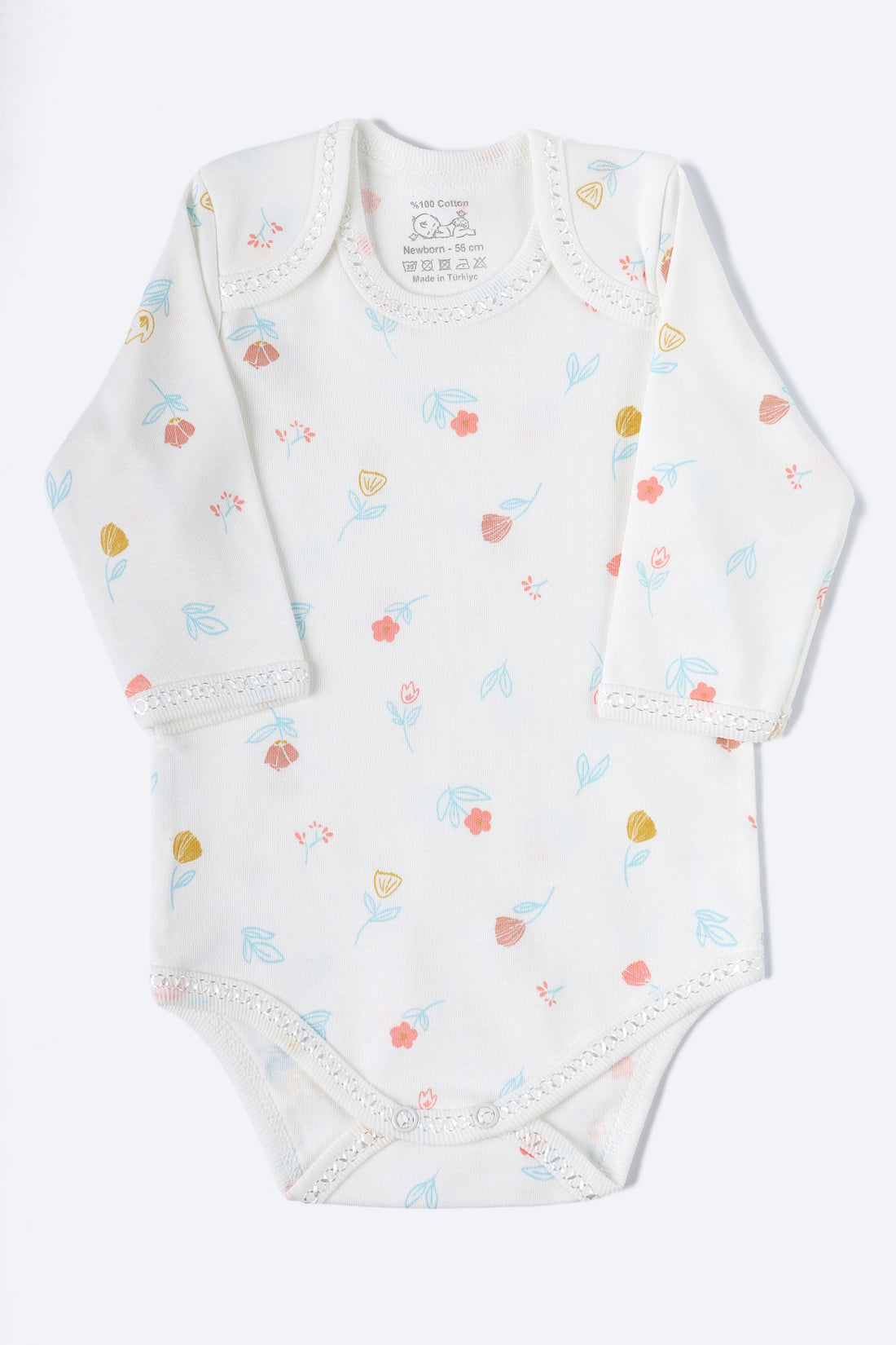 Soft çiçek desenli, uzun kollu body. Bebe yaka, yaka ve manşetler biyeli. %100 pamuk. Altta...