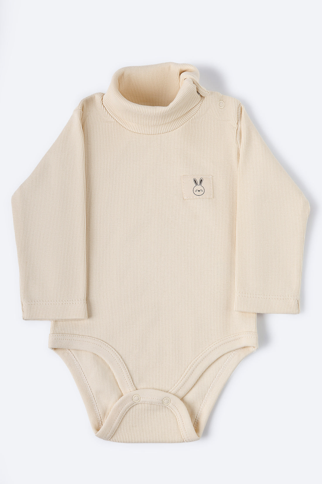 Bej rengi tam balıkçı yaka body. %100 pamuk. Kaşkorse kumaş, uzun kollu, yakada üç çıtçıt....