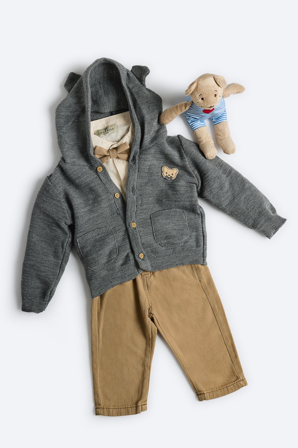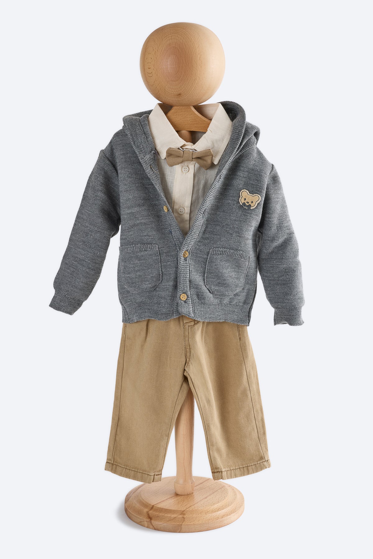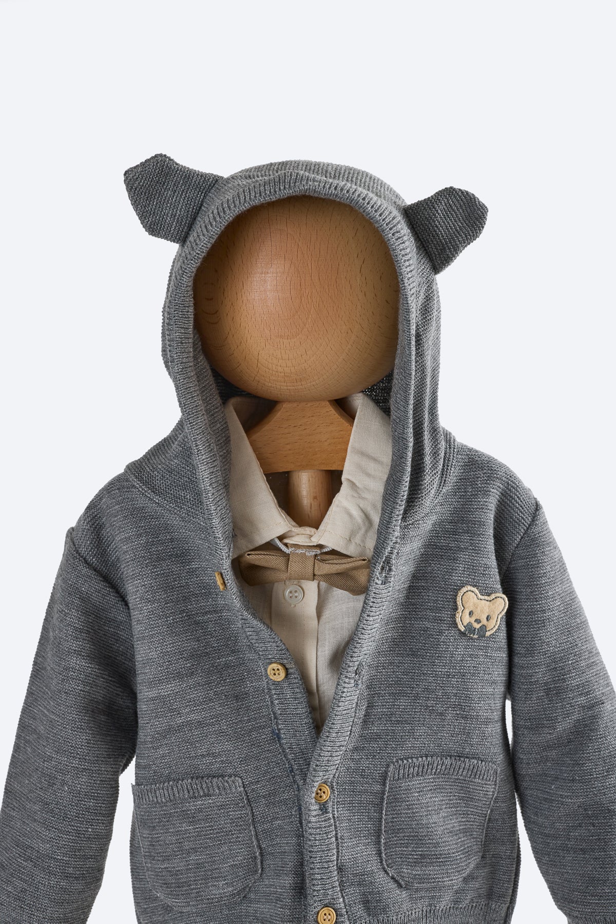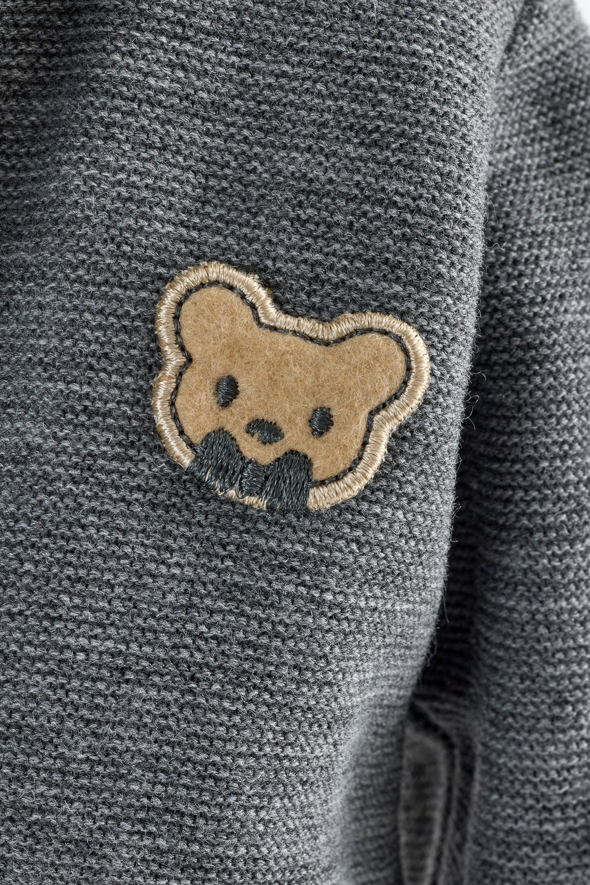 Örgü hırka füme rengi, göğüs kısmında ayı deseni, kapşonlu.