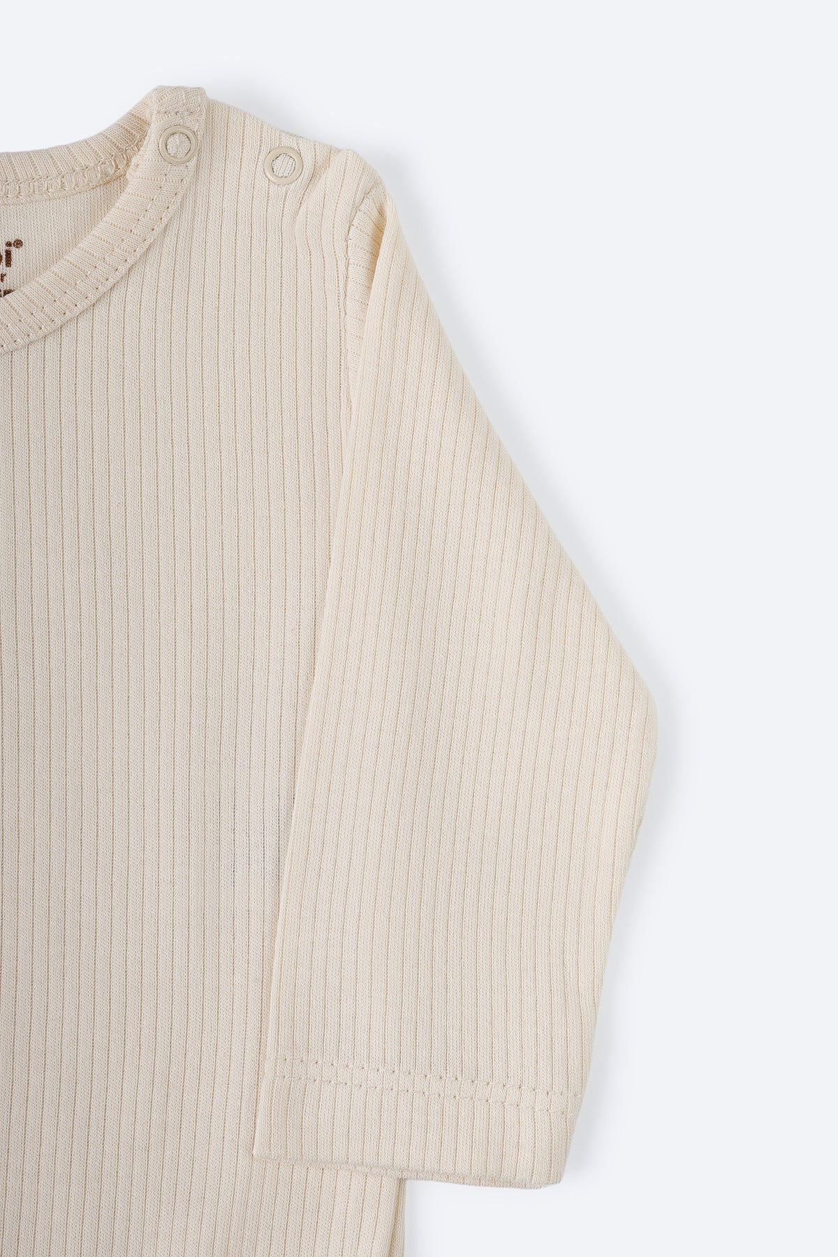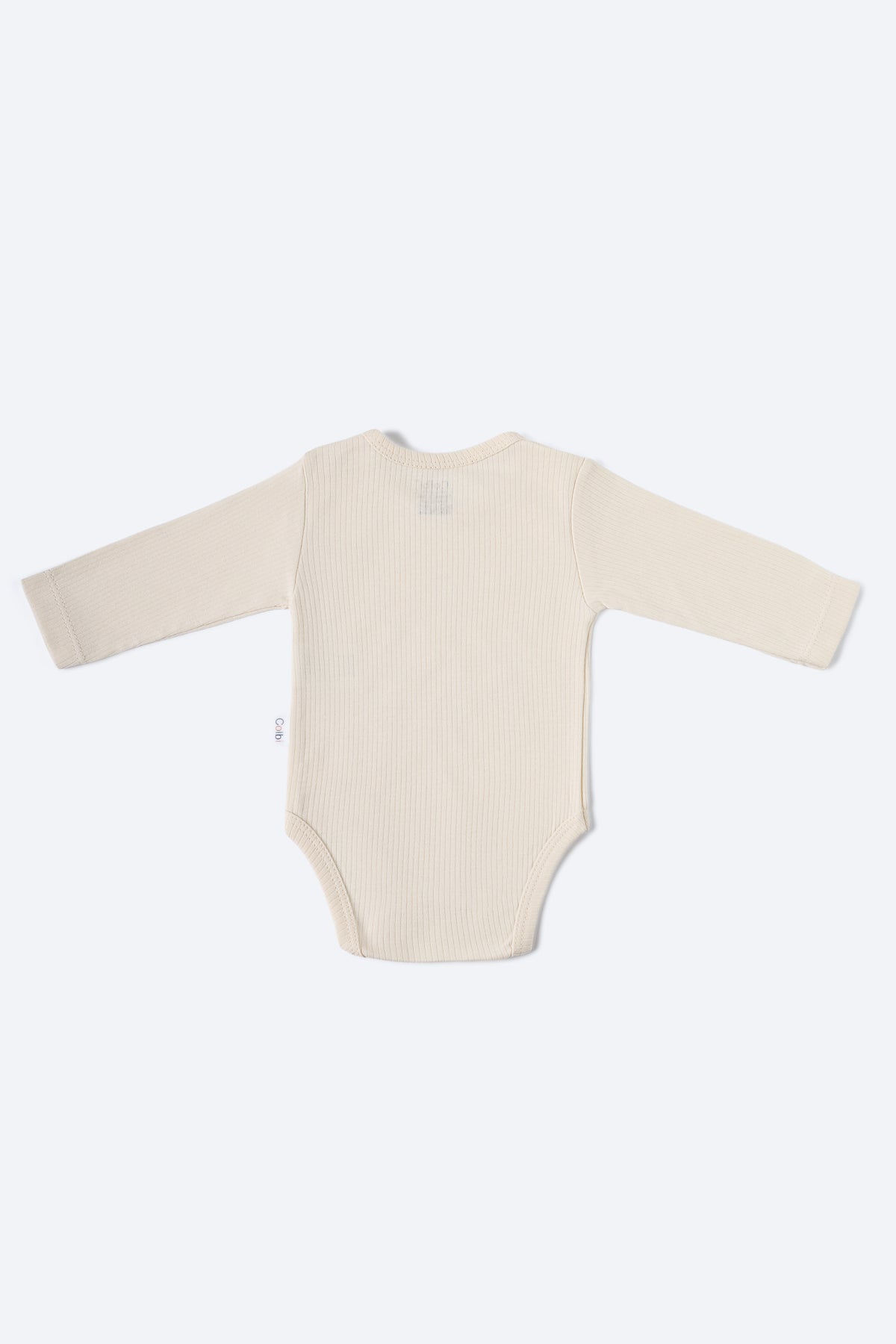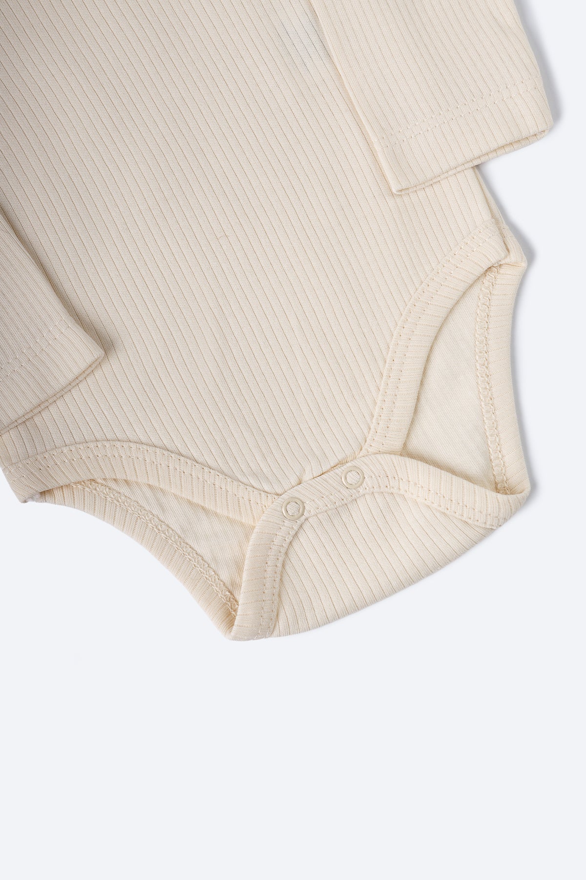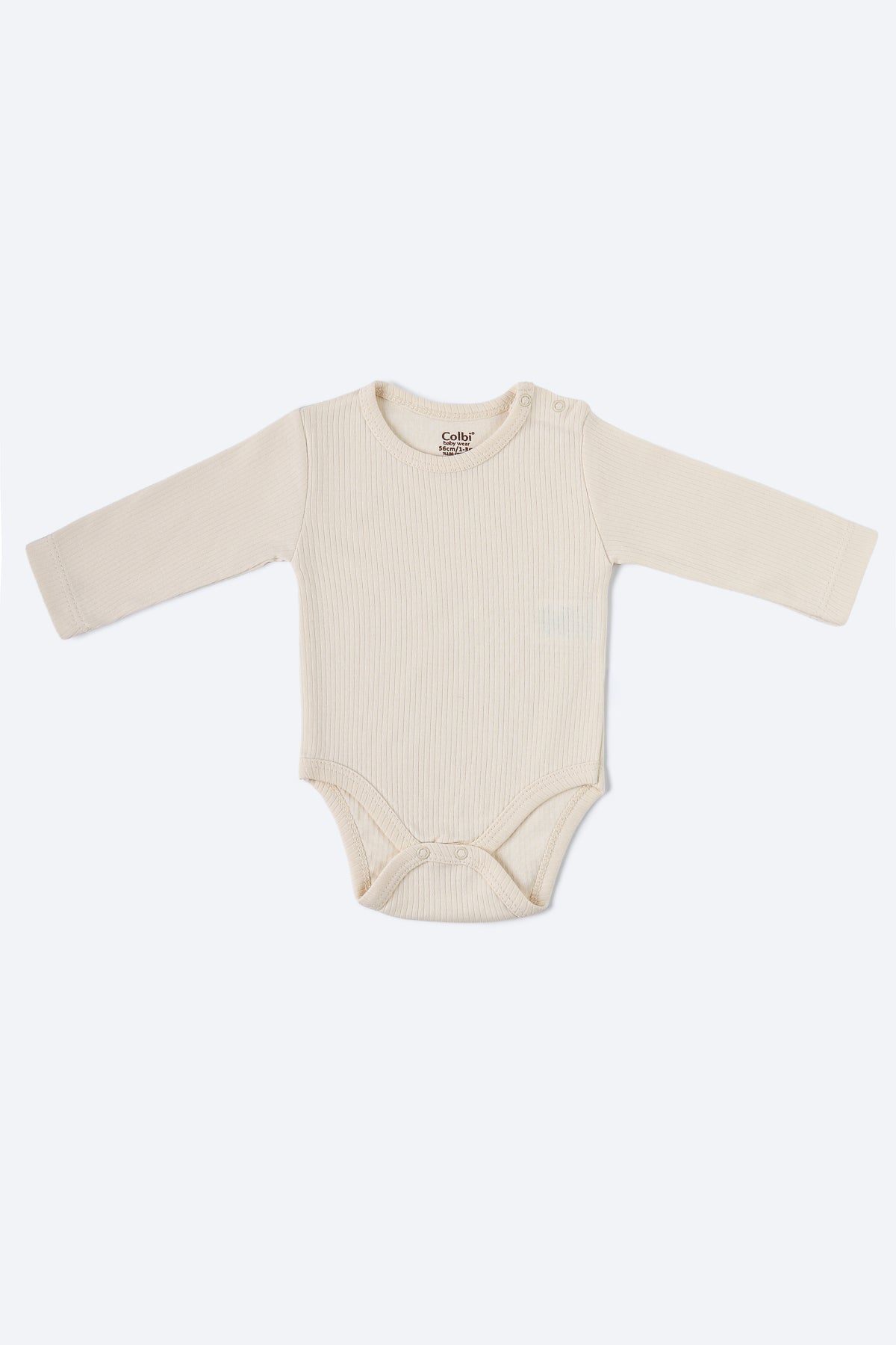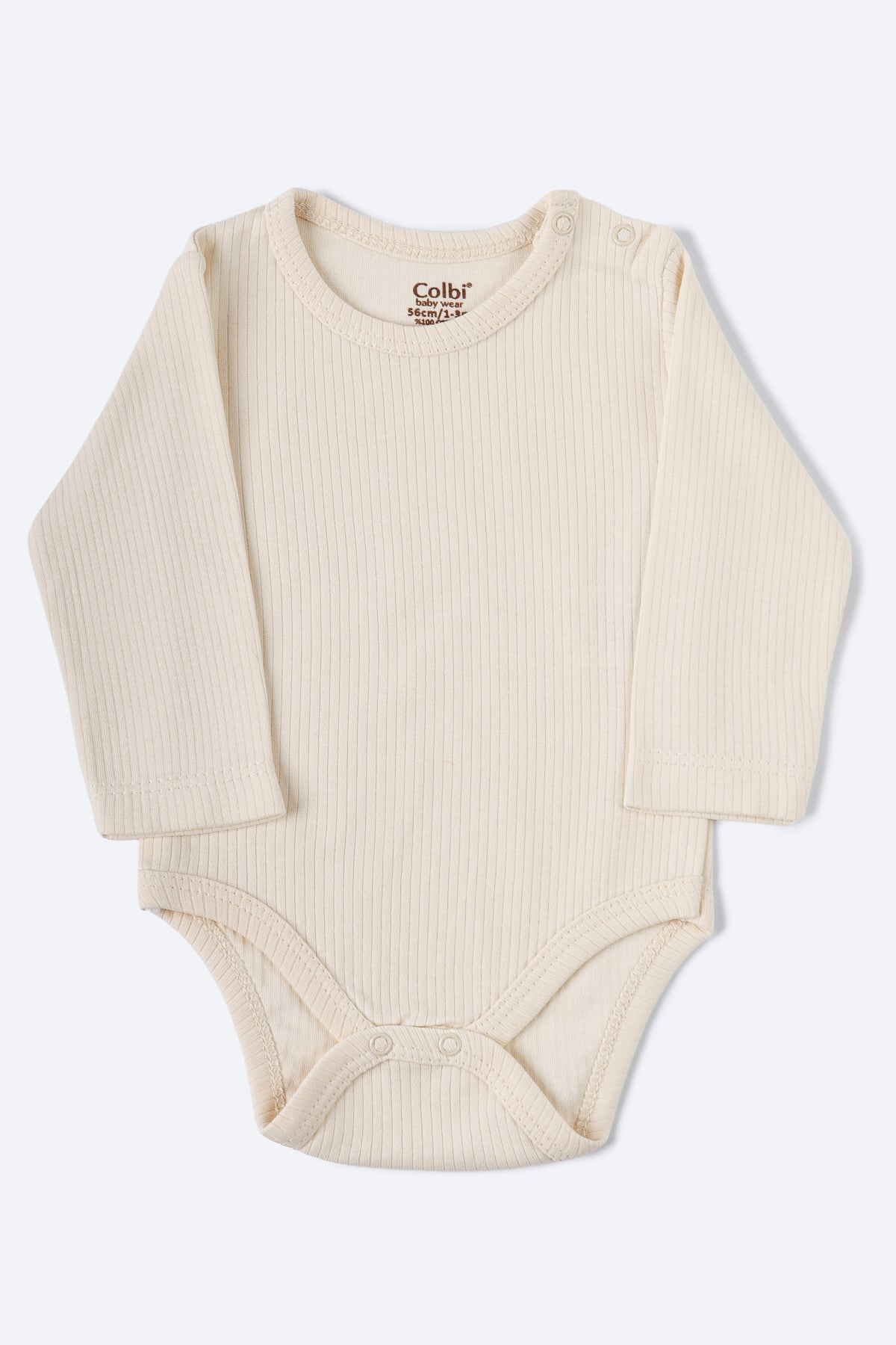 Bej renkli uzun kollu body, bisiklet yaka, raporlu.
