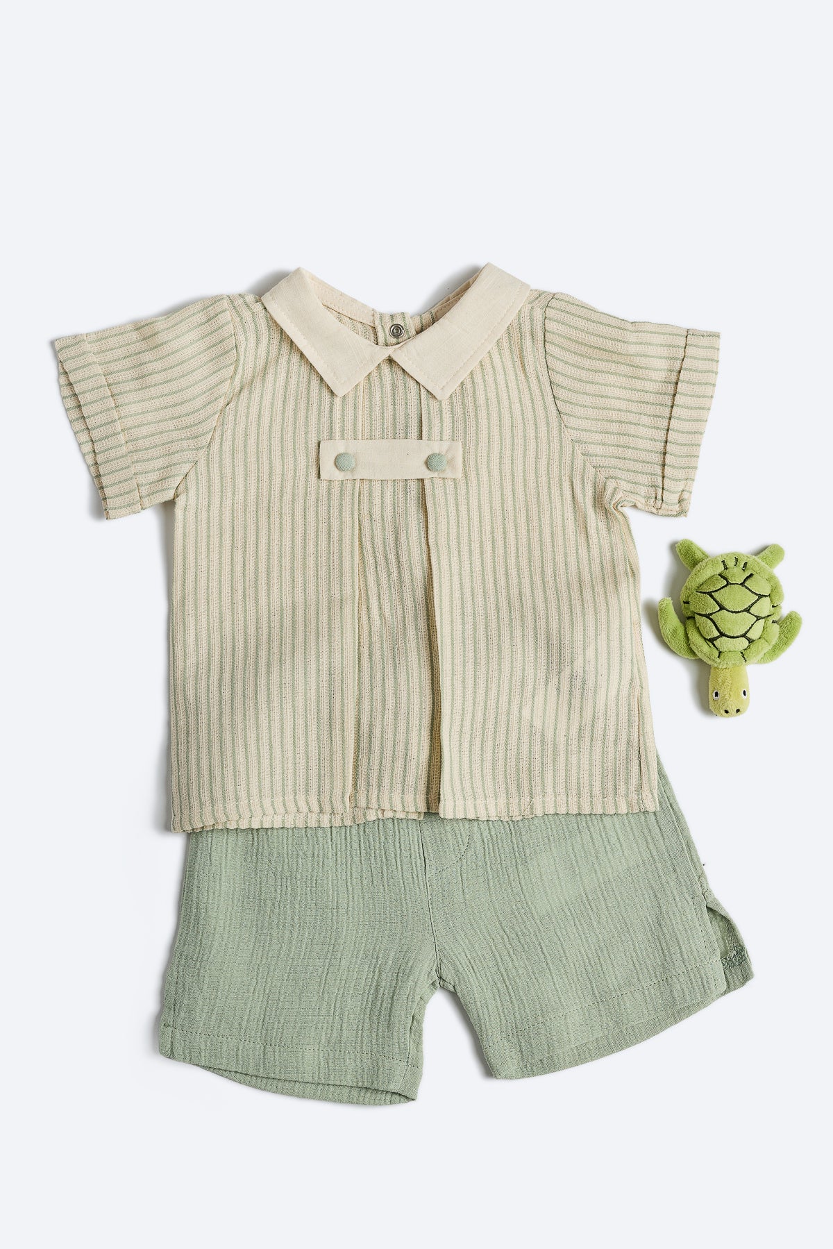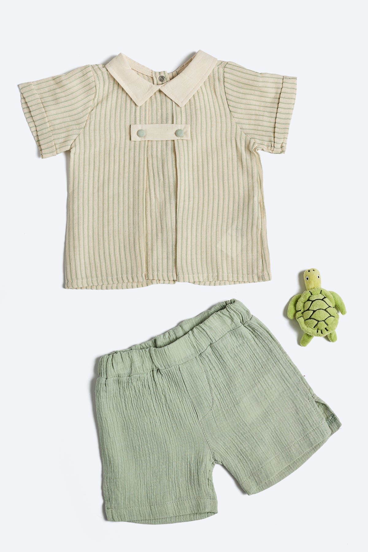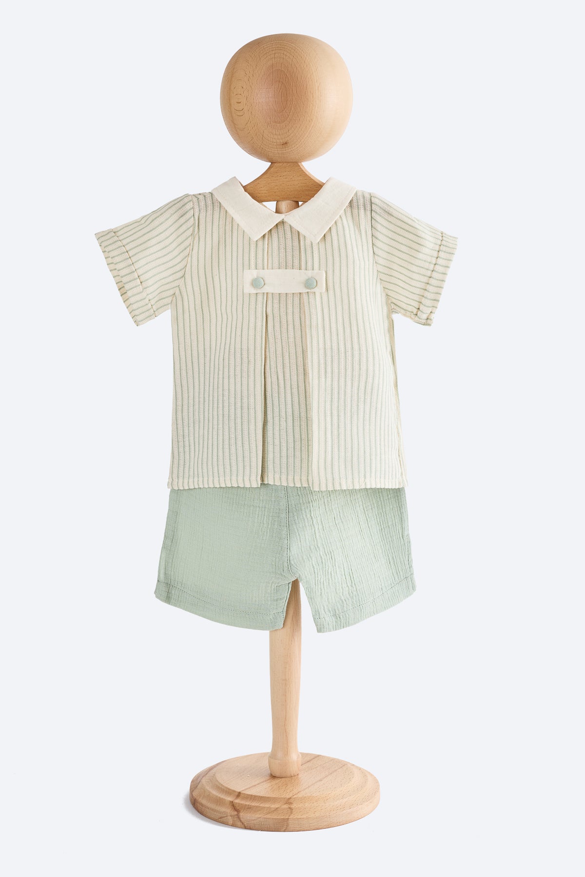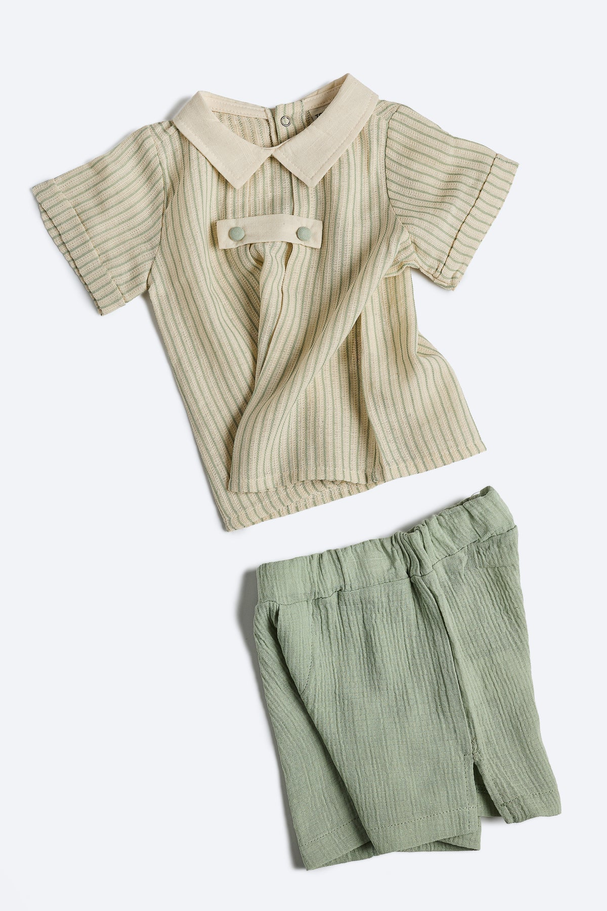 Keten üst bej renk boyuna su yeşili çizgili bebe yaka, sırttan çıtçıt düğmeli, kısa kollu.