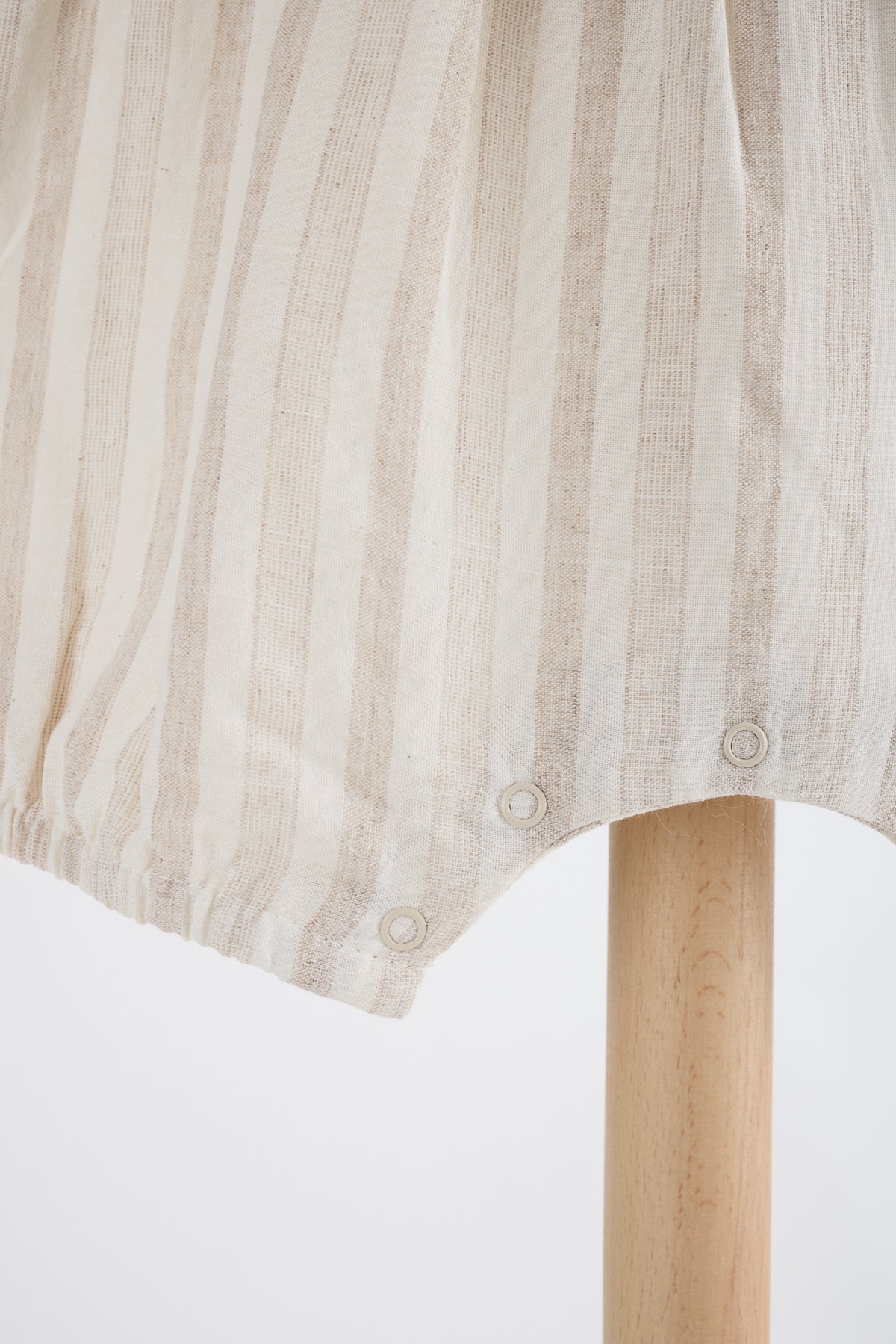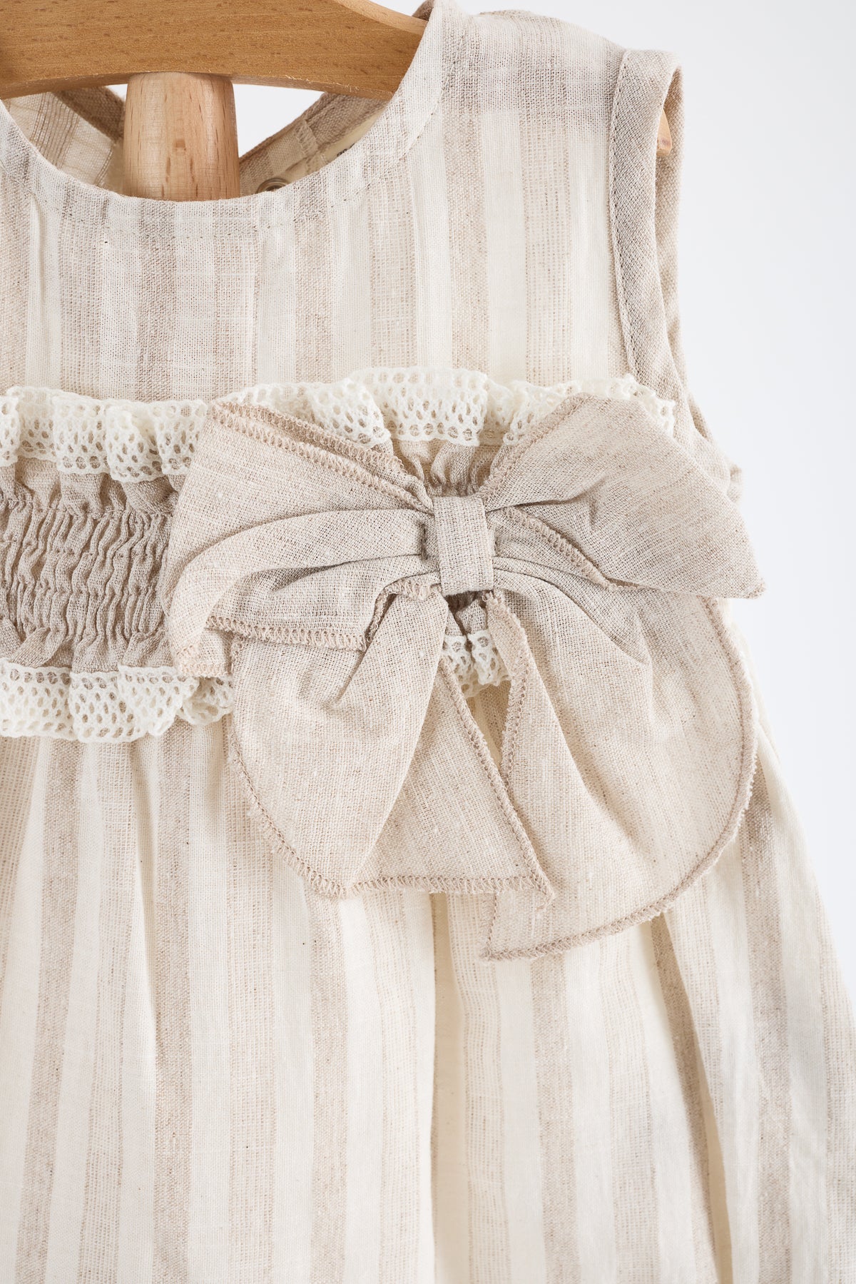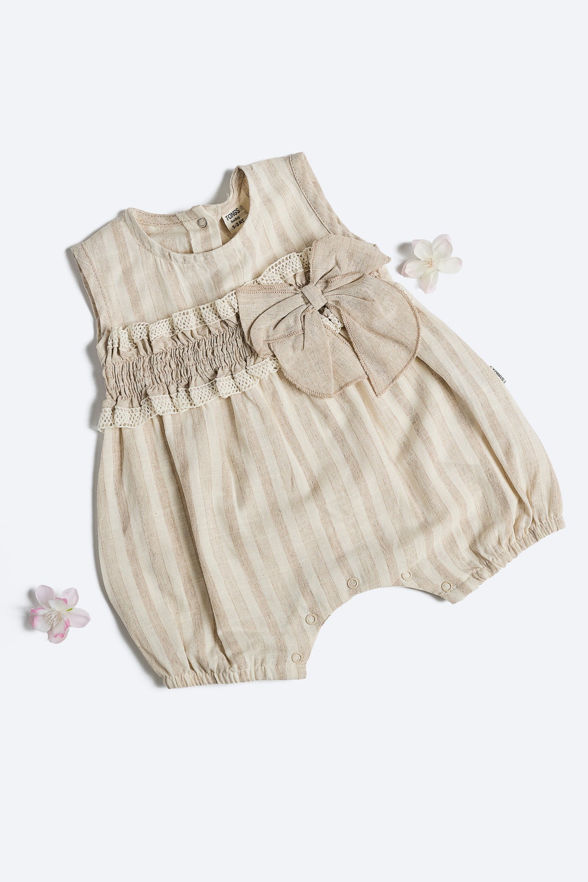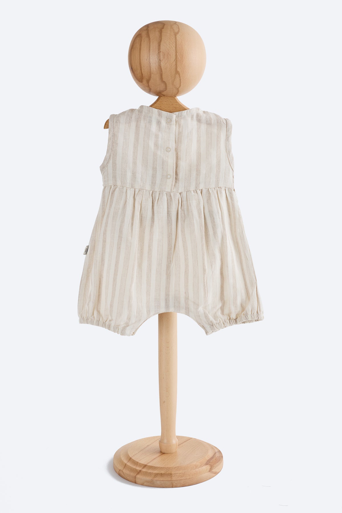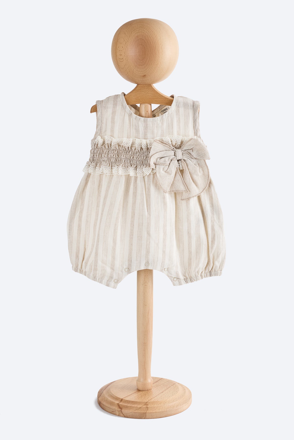 Bej renkli keten kız bebek tulum. Askılı, robada dantel ve fiyonk süslemesi. Sırtta üç çıtçıt, bisiklet yaka.