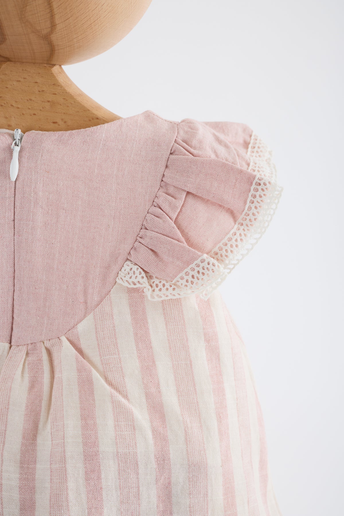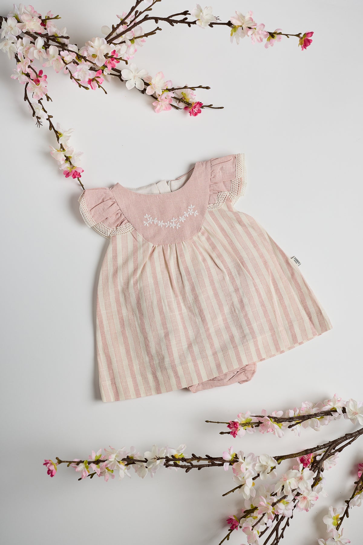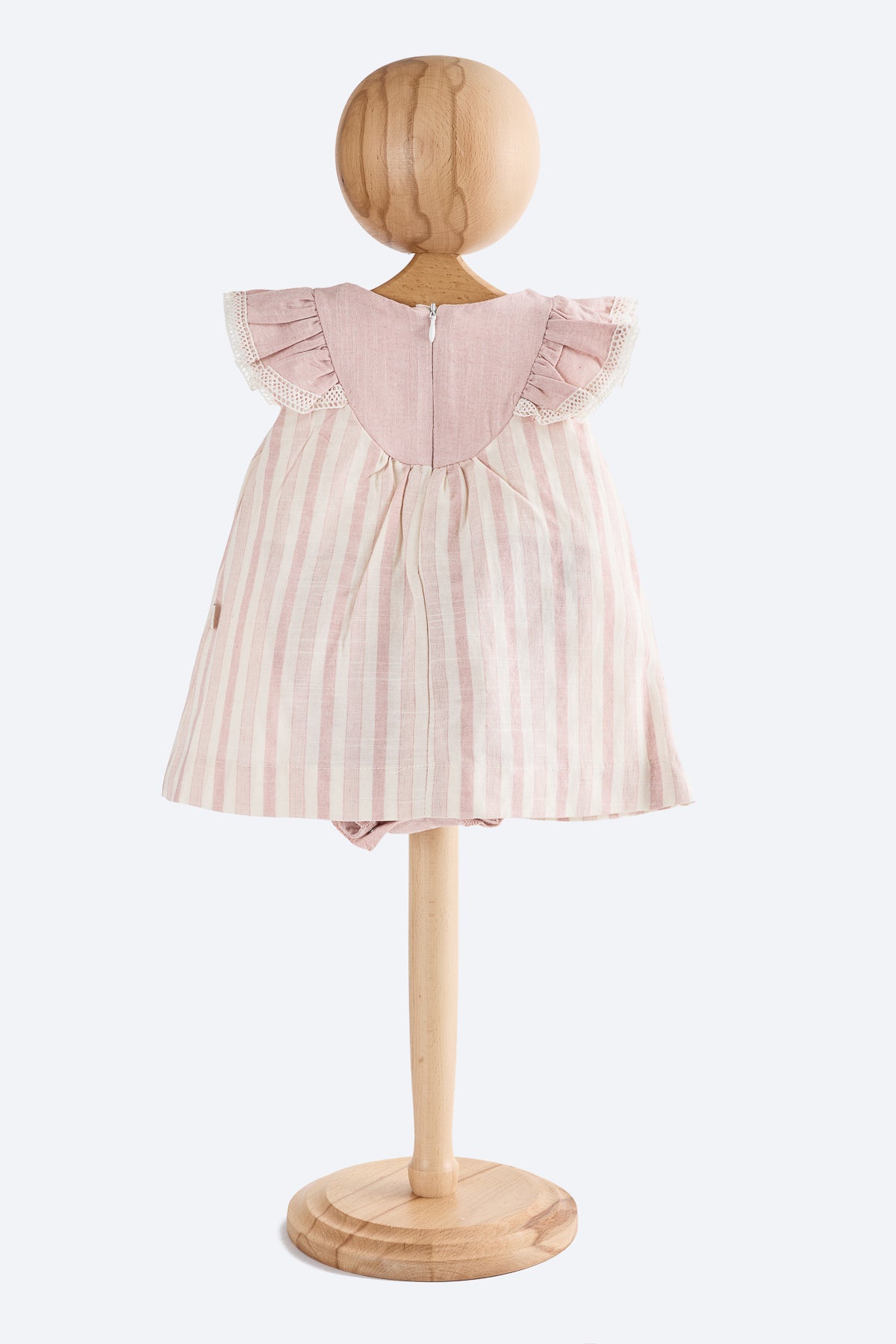 Pembe renkli keten üst ve alt ikili takım, kız bebekler için. Kollar fisto, yaka oyuntusu geniş. göğüste stilize çiçek işlemeleri. Robadan genişleyen kalıp. Uzun elbise formunda. Sırtta fermuar. Alt kısım bütün ayrı parça değil, alttan üç çıtçıtla kolay giyme çıkarma ve alt değiştirme konforu sağlıyor.