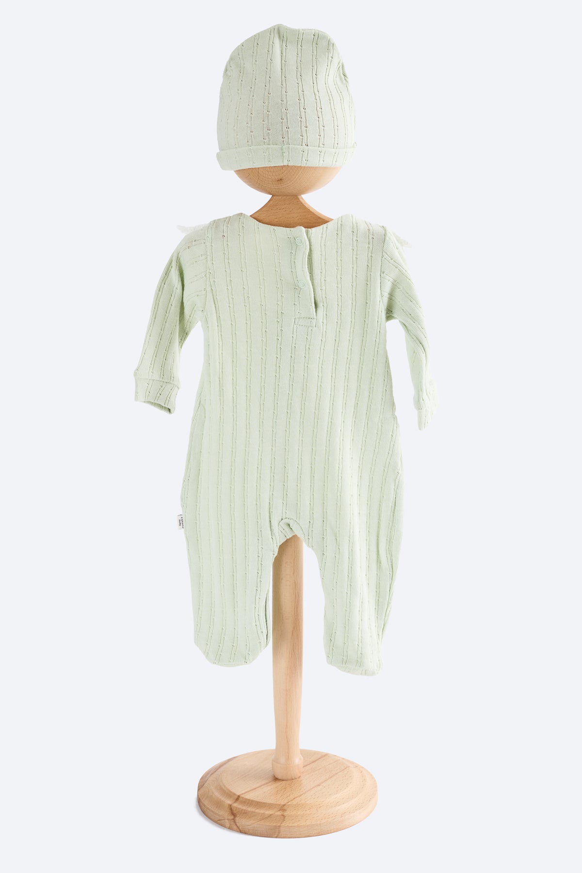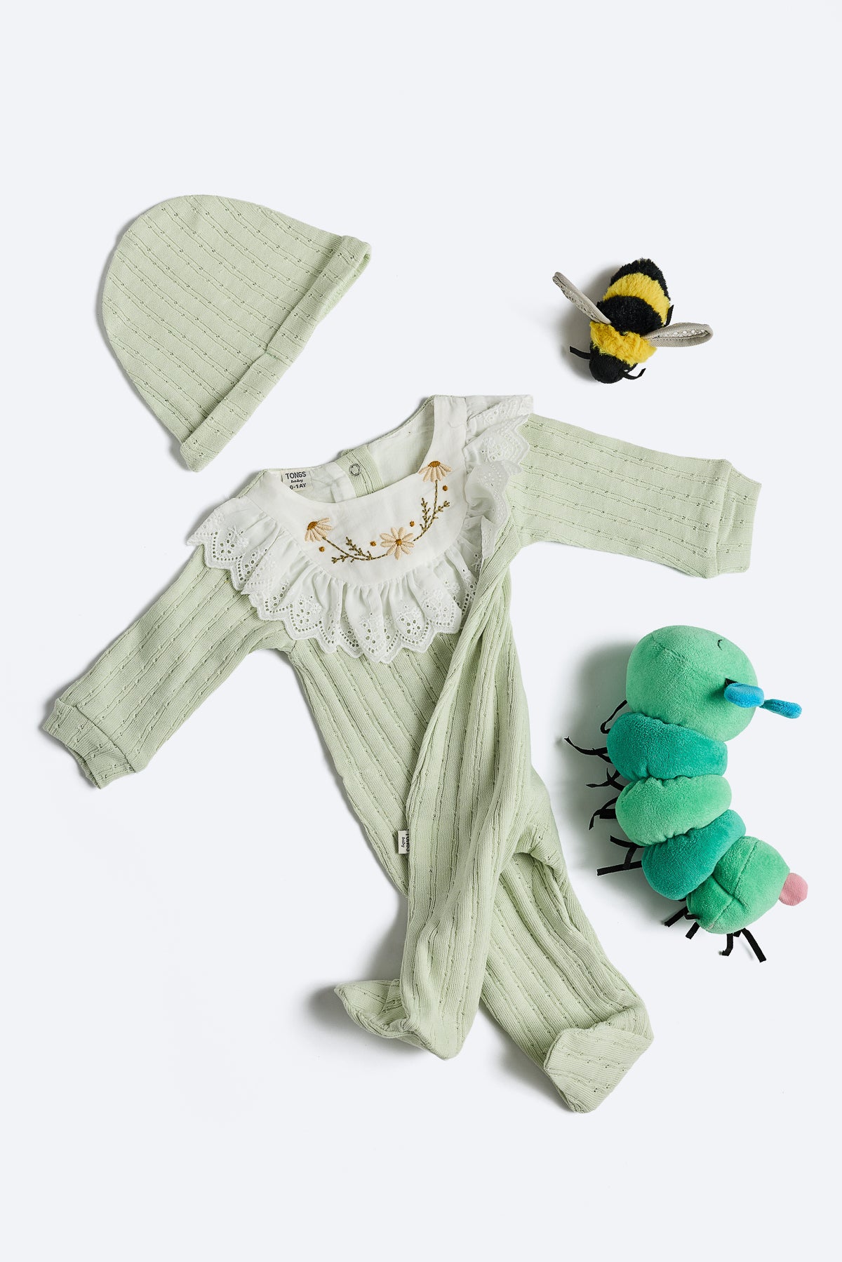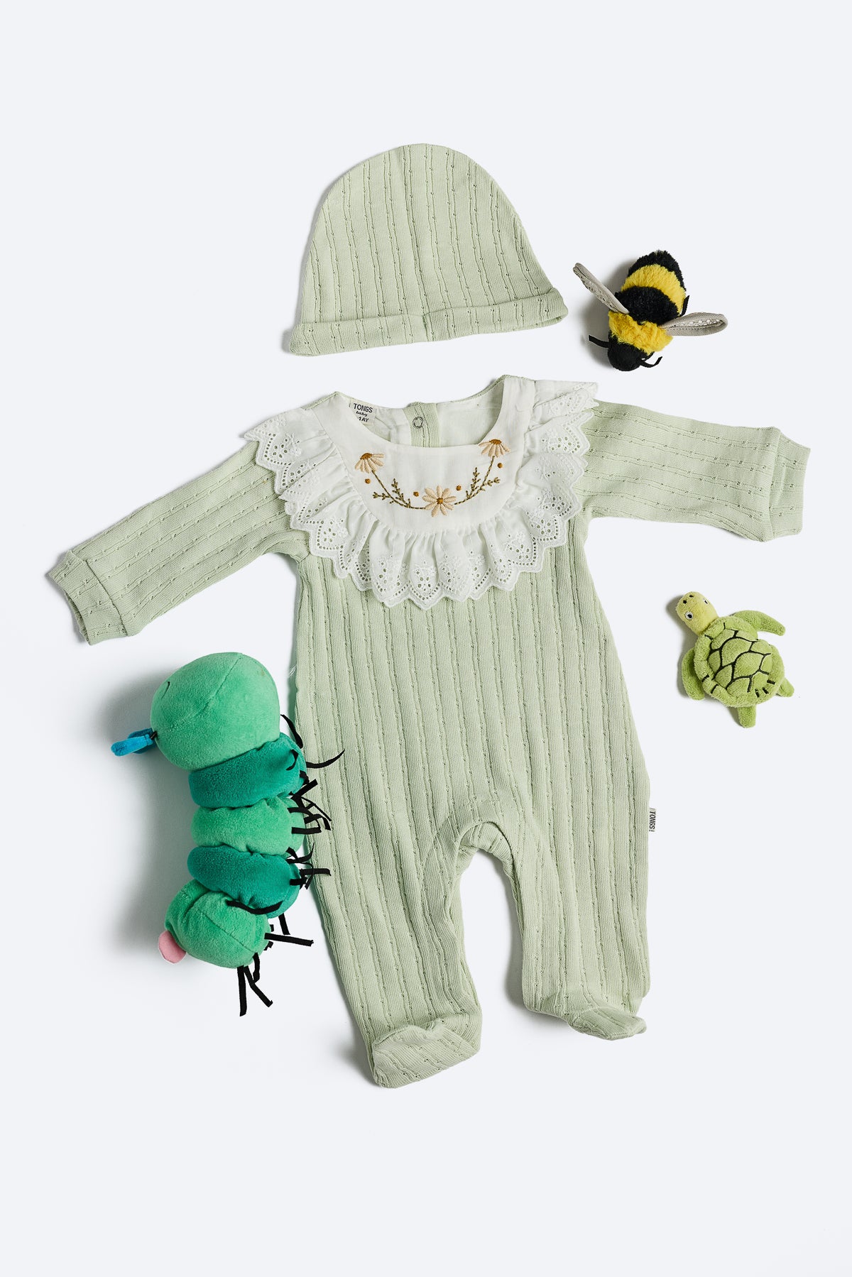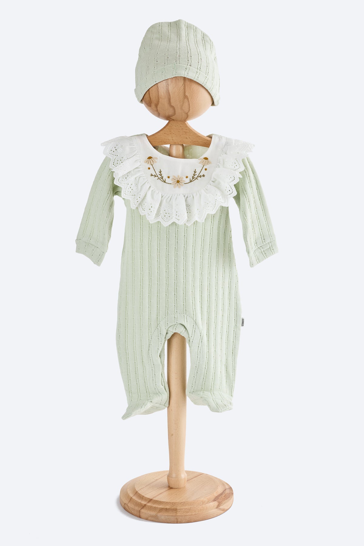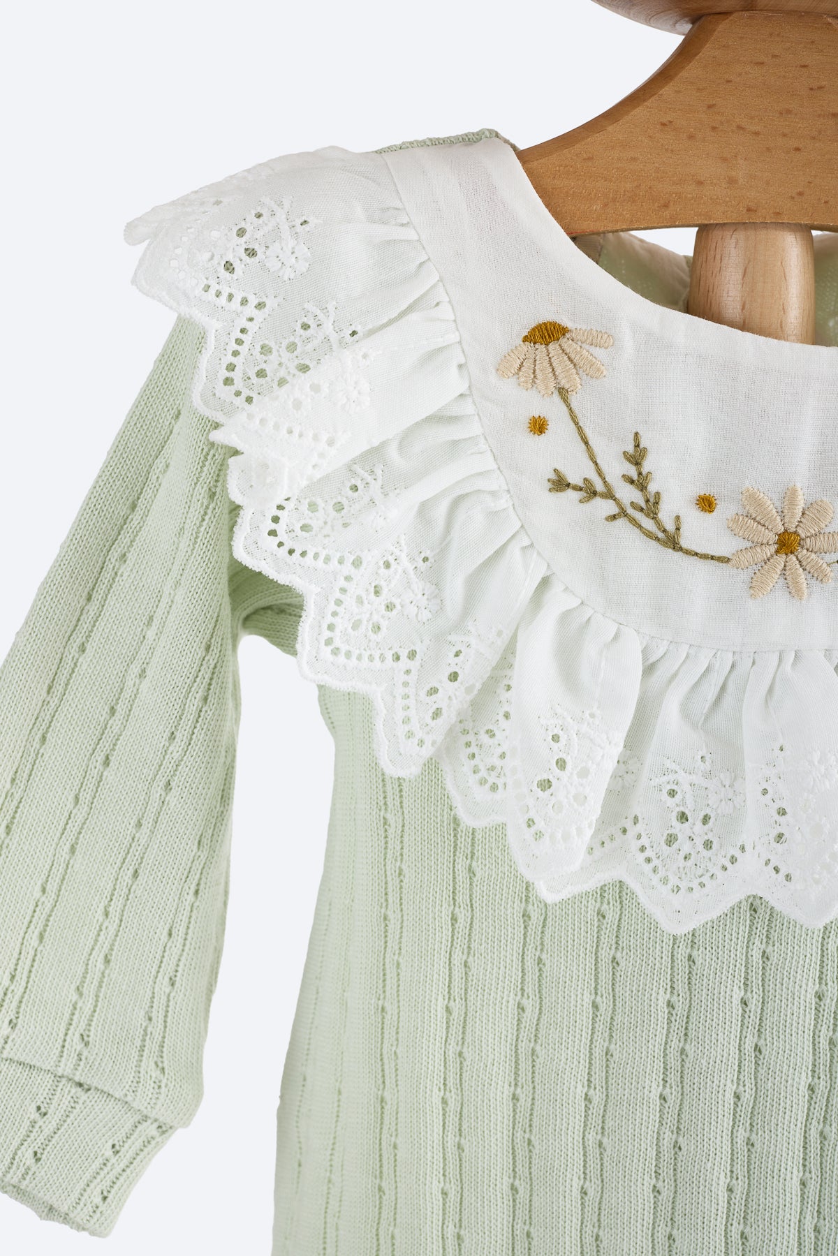 Yeşil renkli kız bebek tulum. Fisto yakalı, yakada çiçek desenleri. Pamuklu kumaş, patikli ve bereli. Sırtta üç çıtçıt, altta alt açmayı kolaylaştıran çıtçıtlar mevcut.