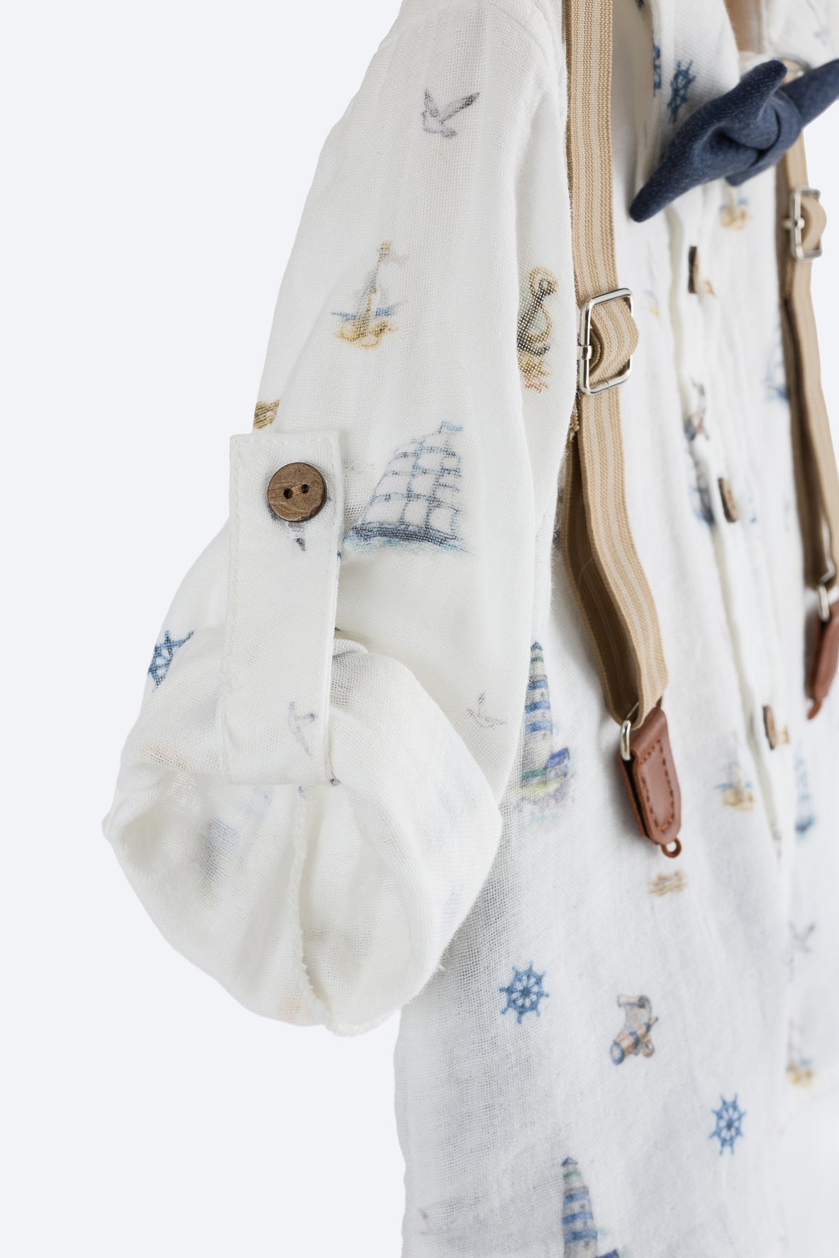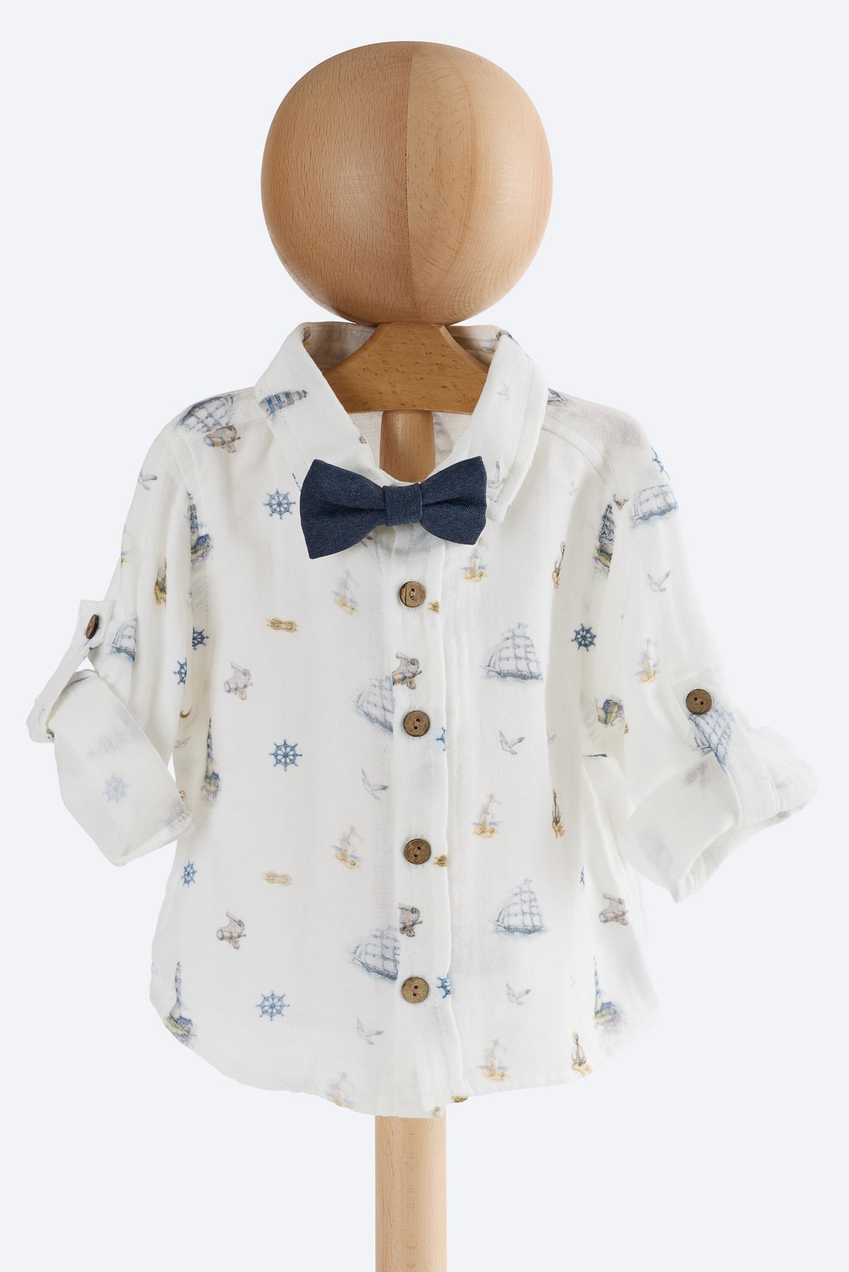 Keten gömlek, mavi yelkenli ve dümen desenli, denizci temalı