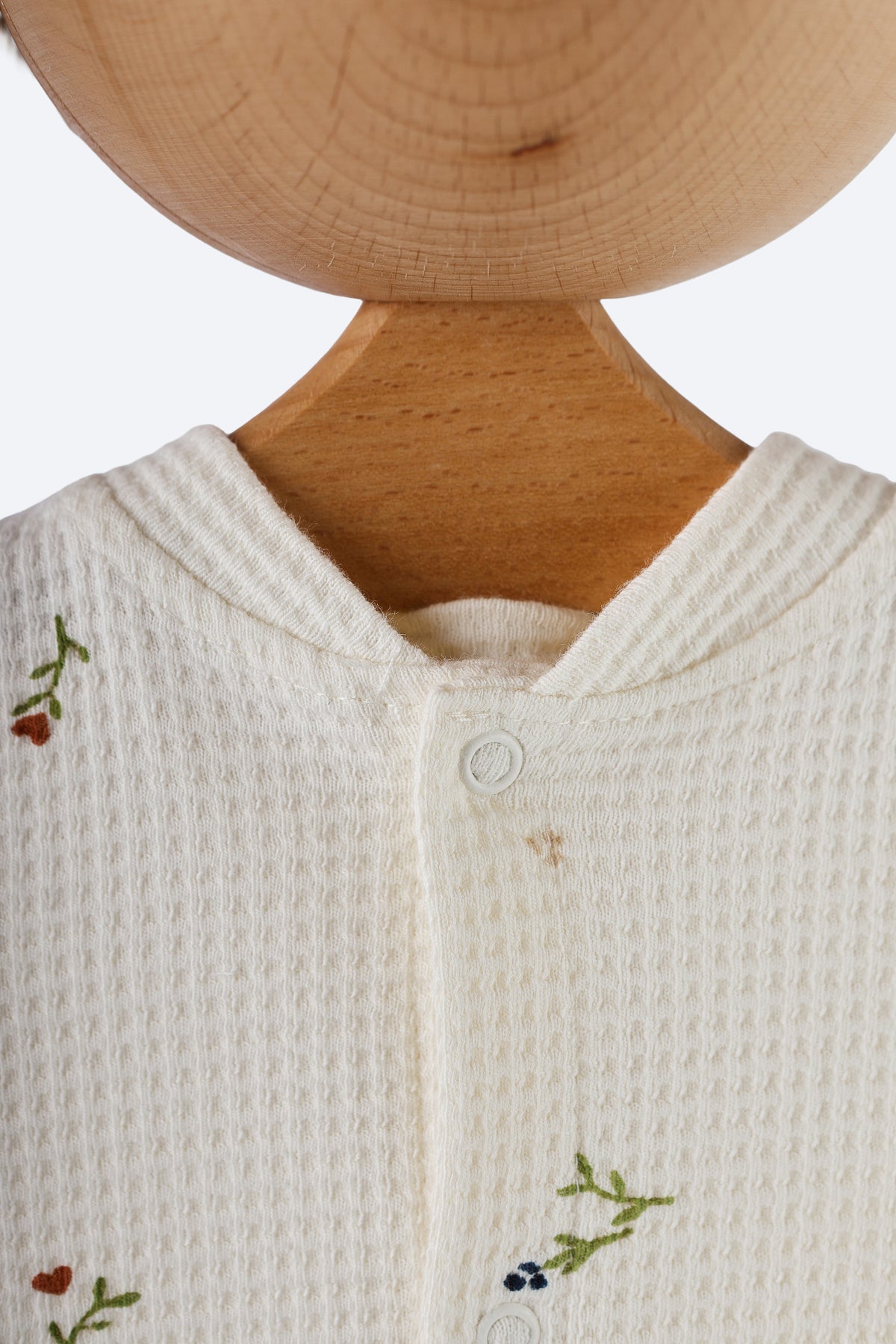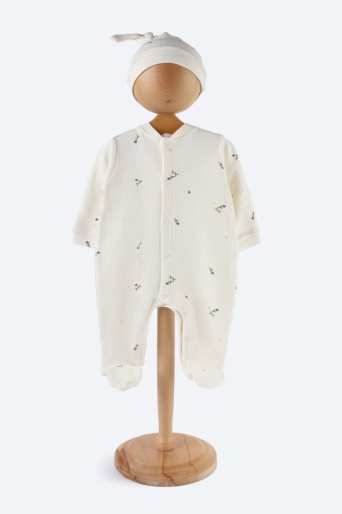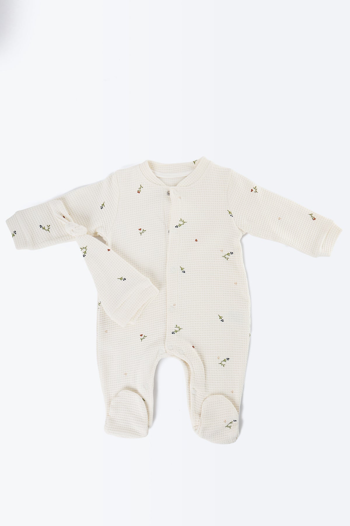 Minik çiçek desenli tulum. Waffle kumaştan % 100 pamuk.