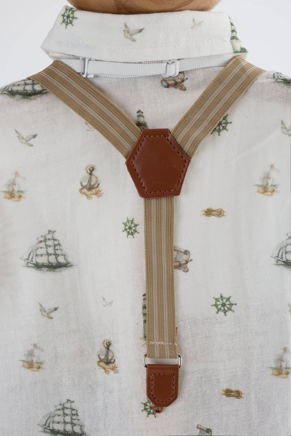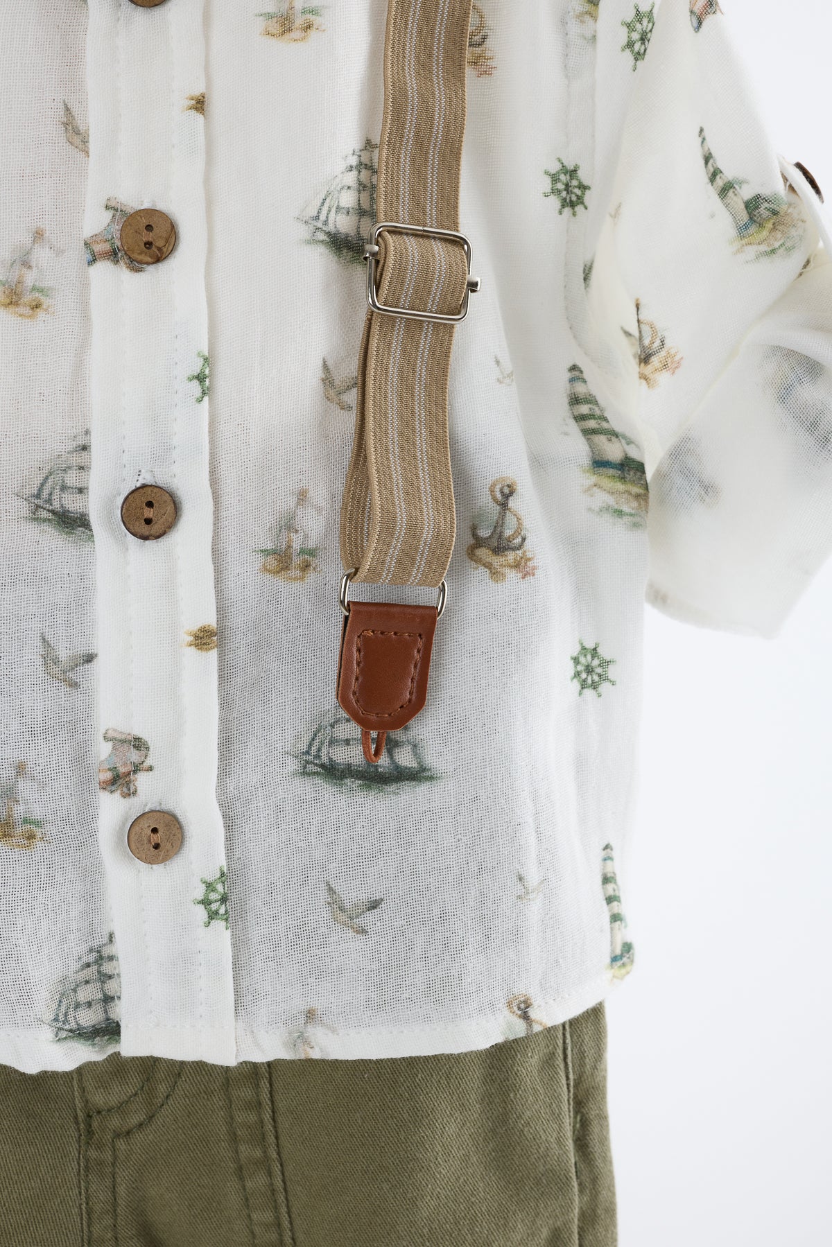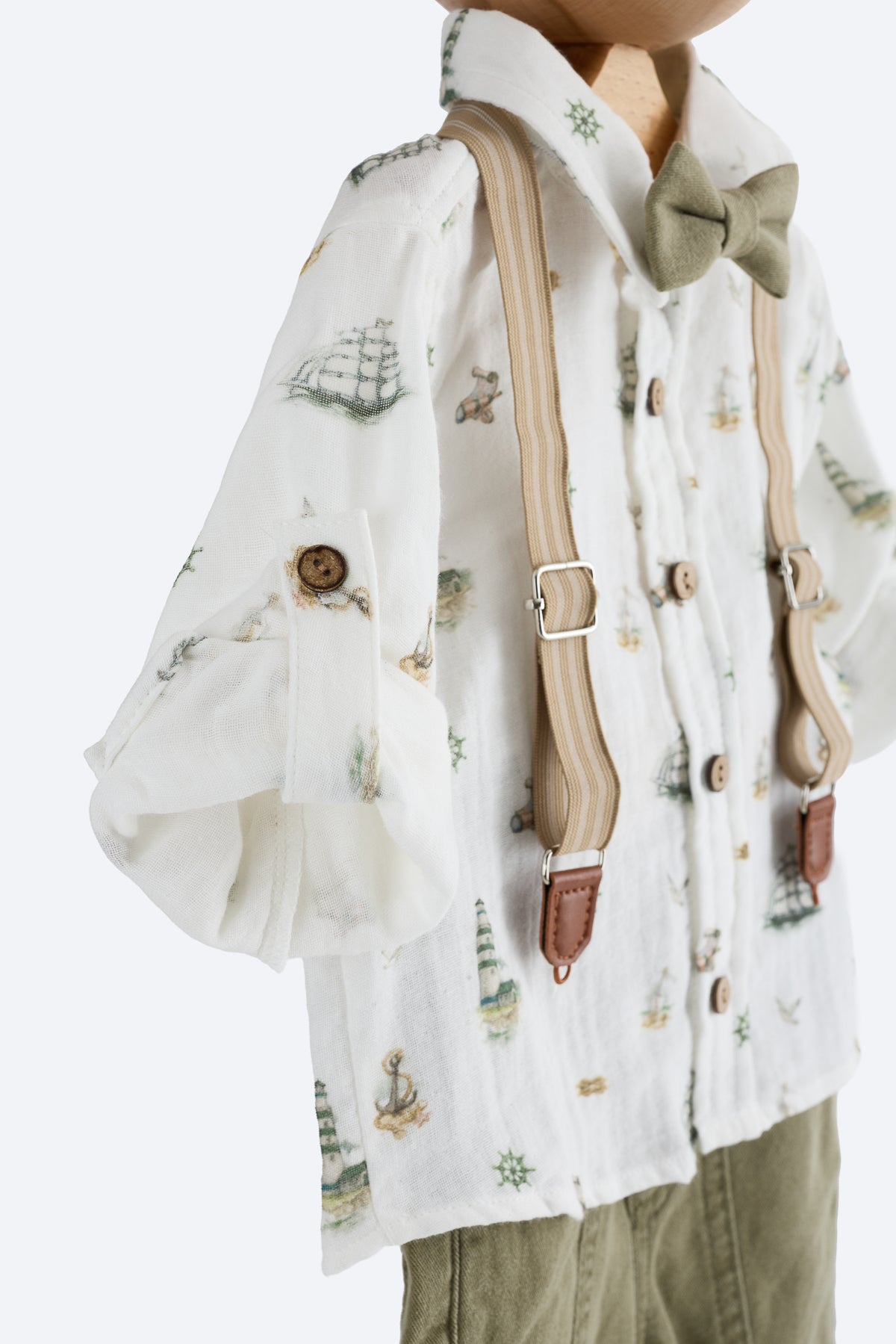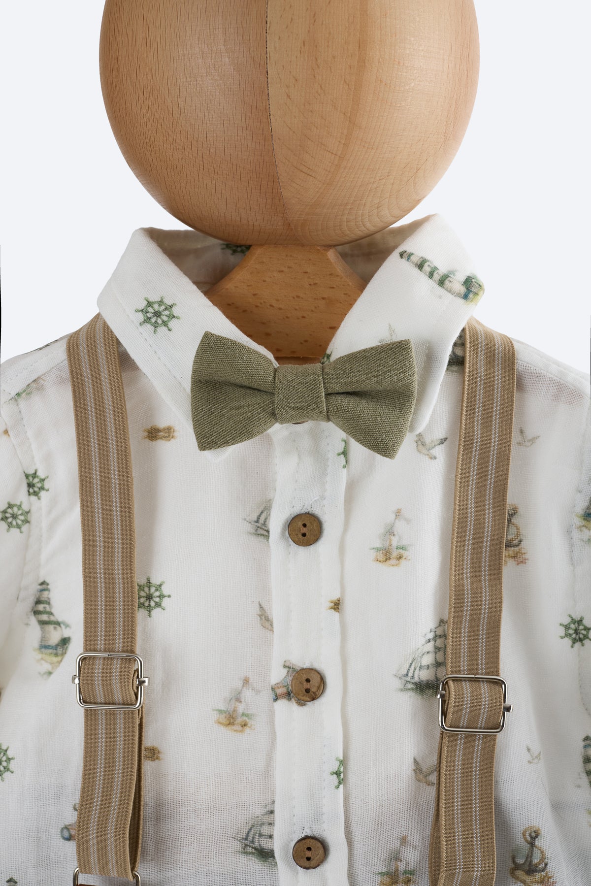 Keten gömlek, yeşil yelkenli ve dümen desenli, denizci temalı